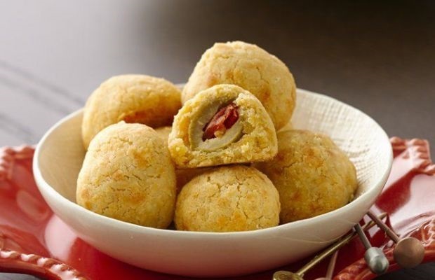 Potrebne namirnice – kesica maslinki sa paprikom (oko 150 g), 200 g posnog kačkavalja, 200 g brašna, 1/2 margarina i susam (po želji). Priprema – Kačkavalj narendati, dodati brašno i margarin, umesiti testo, uzimati po kuglicu testa i u sredinu stavljati po maslinku.
