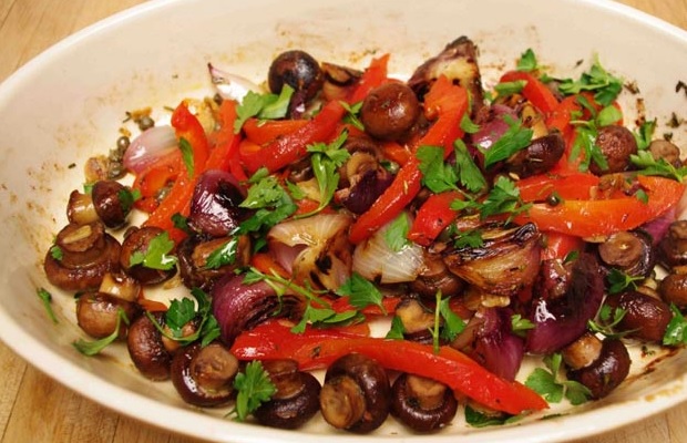 Potrebno je: crni luk, pivo, praziluk, pečurke, pečene paprike, brašno, mleveni orasi, so i biber. Priprema – Pečene paprike uvaljati u brašno i redati u tepsiju. Posebno izdinstati pečurke sa lukom i prazilukom. Začiniti, smesu preliti preko pečenih paprika, a odozgo posuti mlevenim orasima. Preko toga ponovo pečene paprike uvaljane u brašno. Iseći na kocke, zaliti pivom da ogrezne i peći dok ne ispari pivo. Služiti hladno kao posno predjelo.