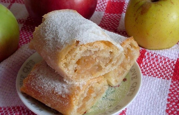 Potrebne namirnice – 250 g kora za pite, 100 g prezli, 100 g šećera, 1/4 kafene kašičice ekstrata vanile, 1/4 kafene kašičice cimeta u prahu, 50 ml ulja, 300 g izrendanih jabuka, 80 ml kisele vode, 10 ml ulja (za premazivanje kora), 20 ml kisele vode i prah-šećer. Priprema – Dobro promešati prezle, šećer, ekstrat vanile i cimet. U smesu usuti ulje (50 ml) i dobro izmešati da se dobije fina, rastresita, smesa.