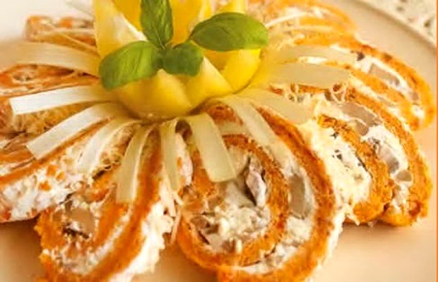 Ohlađen rolat premazati sitnim sirom, posuti rendanim trapistom i iseći na tanke šnite.