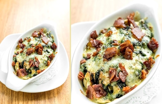 U namašćenu posudu naizmenično redajte blitvu, pa isečeno suvo meso i na kraju sve prelijete pripremljenim sosom i pospete ostatkom permezana. Zapecite u rerni zagrejanoj na 180 stepeni oko deset minuta.
