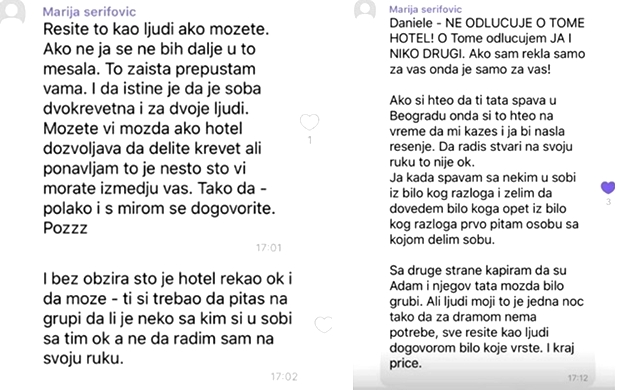 Naime, Adam Labunski je objavio privatnu prepisku sa Marijom Šerifović, iz koje se može zaključiti da je problem nastao u hotelskoj sobi u kojoj su odseli on i drugi Marijin kandidat. Problem je, sudeći prema porukama, nastao kada je drugi kandidat doveo svog oca da spava u njihovoj sobi, zbog čega je očigledno nastao sukob, koji je prouzrokovao diskvalifikaciju Labunskog. Poruke koje je objavio Adam pročitajte u nastavku.