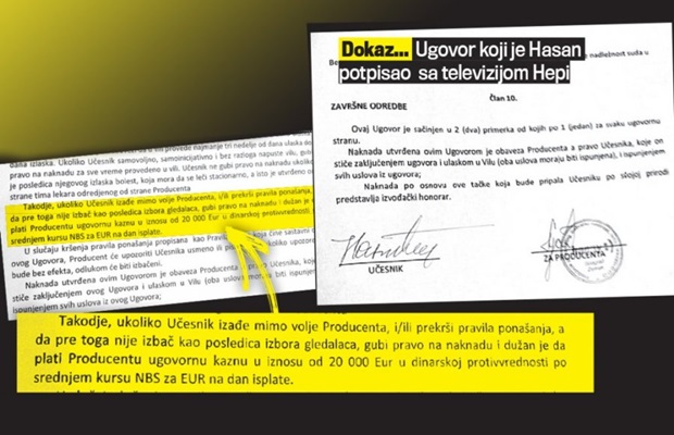 Hasan Dudić je slagao da nema ugovor sa TV Hepi za boravak u „Parovima“, odakle je izbačen zbog prebijanja Jelene Golubović. Kurir je došao u posed overenog dokumenta koji je Dudić potpisao. Prema ugovoru, on mora Hepiju da isplati 20.000 evra, koliko iznose penali ukoliko je učesnik prekršio pravila. U jednoj od stavki piše da su fizičko nasilje i vređanje na nacionalnoj, verskoj, polnoj i etničkoj osnovi teško kažnjivi. -“Ugovor je zaključen 26. februara 2015, kad je Hasan odlučio da će učestvovati u Parovima. Od sebe pokušava da napravi žrtvu jer je svestan posledica svog ponašanja”, – rekao je dobro obavešten izvor iz produkcije.