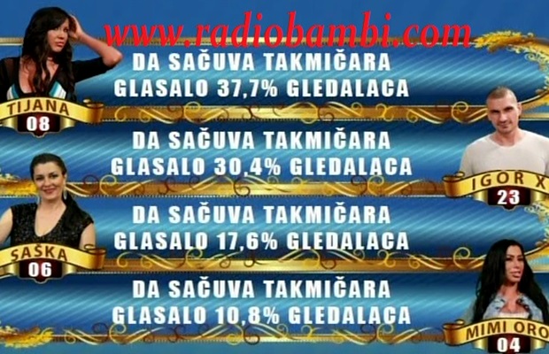 Ukućani u vili Parova protekle večeri ostali su bez teksta. Za izbacivanje su bili nominovani, Tijana, Igor, Mimi i Saška. Posle preseka glasova i otvaranja tabele, najmanji broj glasova publike imala je Mimi i ona je napustila vilu. Većina ukućana je iznenađena ovim, a posle otvaranja poslednjeg mesta na tabeli, Gastoz i Ejmi su se demonstrativno polili špricerom.
