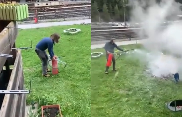 Dok je objašnjavao policajcima gde trebaju doći, Švajcarac je aktivirao protivpožarni aparat i istresao ga na janje. Gospođa sa balkona je sve snimila.