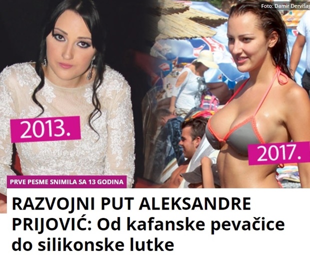 -“Estetski hirurg postao joj je najbolji drug, pa sada, samo sedam godina nakon što je kročila na estradu, ona je gotovo neprepoznatljiva. A sa pokušajima da osvoji pevački tron, Prija je osvojila i Filipa i to Živojinovića. Pre nego što je postala snajka Lepe Brene, ona se dosta fizički promenila. Stavila je silikone u grudi, povećala usne, smanjila nos, stavila nove zube i istetovirala obrve. Radila je i uši, a priča se da se pozabavila i jagodicama. Njoj se to isplatilo, pa sada mnogi, osim što vole da je slušaju, uživaju i u njenom izgledu. Trenutno ima koji kilogram viška, ali ne može joj se zameriti jer se tek porodila, ali će se Prija sigurno pozabaviti povratkom linije, pa makar opet išla kod plastičara”, – piše između ostalog ‘Kurir‘.