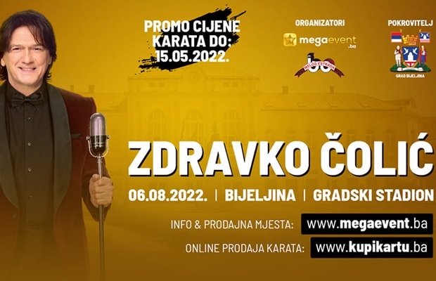 U organizaciji DOO “Mega Event Ba” i DOO “Melos Estrada”, a pod pokroviteljstvom grada Bijeljina, 6. avgusta (subota) na Gradskom stadionu u Bijeljini biće održan spektakularni koncert najveće EX-Yu zvezde Zdravka Čolića. Prvi kontigent karata po promo cenama je u prodaji do 15. maja, a promo cene karata su parter 10 KM i fanpit 15 KM.