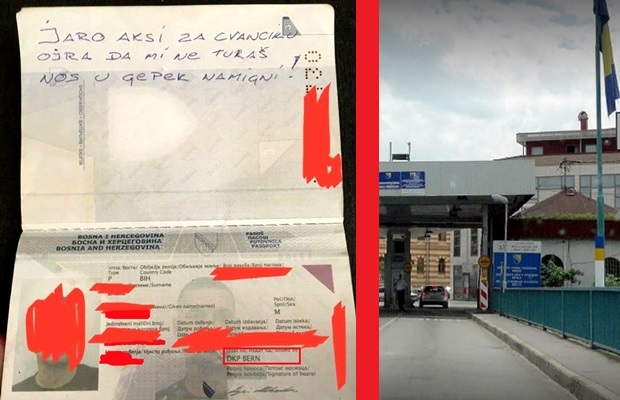 -“Jaro aksi za cvanciku ojra da mi neturaš nos u gepek namigni”, – ispisano je hemijskom olovkom na jednom listu pasoša koji je kako se vidi izdat u diplomatsko-konzularnom predstavništvu BiH u Bernu.