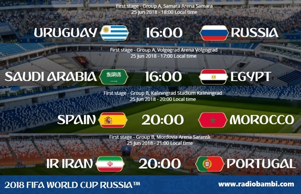 Dvanaestog dana Svetskog prvenstva u Rusiji igraju se četiri utakmice, u grupama A i B. Od 16 časova se igraju dva meča, oba u Grupi A – Rusija i Urugvaj se bore za prvo mesto, dok će Egipat i Saudijska Arabija igrati u meču bez rezultatskog značaja. Od 20 časova kreće rasplet u Grupi B. Iran će igrati protiv Portugala, dok će Španija igrati sa Marokom.