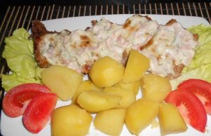 Potrebne namirnice – 4 svinjska kotleta, 2 supene kašike ulja, po ukusu soli, po ukusu mleveni crni biber, 200 g kiselih krastavčića, 100 g šunke,...