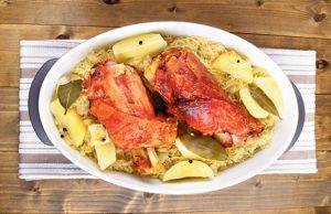 Potrebne namirnice – 3 dimljene svinjske butkice, 9 listova kiselog kupusa, malo suvog mesa, lovorov list i nekoliko zrna bibera.