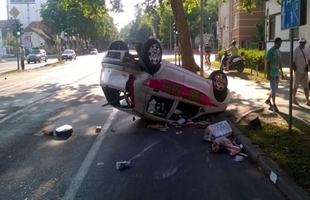 Ovaj automobil se kretao istim smerom i od siline udara je podigao taksi, usled čega se i prevrnuo.