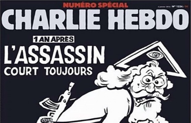 Ukupno 17 ljudi poginulo je u napadu pre godinu dana. Satirični nedeljnik obeležava godišnjicu napada na sedište časopisa naslovnom stranicom na kojoj je prikazan čovek sa bradom koji predstavlja Boga i kalašnjikovim preko ramena uz natpis: “Godinu dana kasnije: Ubica je još tu”.