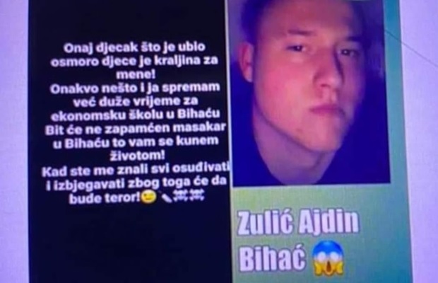 Posle jučerašnjeg stravičnog napada u Beogradu, sličan krvav pohod za učenike i zaposlene u Mešovitoj srednjoj školi u Bihaću (FBiH), na društvenim mrežama je najavio Ajdin Zulić, bivši učenik ove škole. -“Onaj dečak što je ubio osmoro dece je kraljina za mene! Onakvo nešto i ja spremam već duže vreme za ekonomsku školu u Bihaću. Biće nezapamćen masakr u Bihaću, to vam se kunem životom! Kad ste me znali svi osuđivati i izbegavati, zbog toga će da bude teror”, – napisao je Zulić na društvenim mrežama.