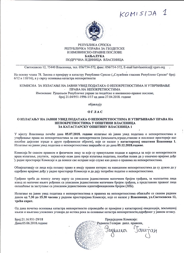 Izlaganje na javni uvid podataka o nepokretnostima i pravima na nepokretnosti obavlja se svakim radnim danom od 07:30-15:00h u radnim prostorijama Komisije, koje se nalaze u Svetosavskoj ulici broj 12 (treći sprat).