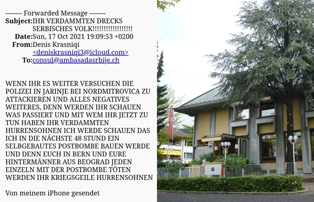 Na jedan od zvaničnih mailova Ambasade Srbije u Švajcarskoj upućena je elektronska poruka u kojoj se preti diplomatskom predstavništvu, ali i rukovodstvu Srbije. Ambasador Srbije u Bernu Goran Bradić prijavio je slučaj pretnje nadležnim organima i zatražio pojačan nadzor za sva tri diplomatsko-konzularna predstavništva Srbije u Švajcarskoj – u Bernu, Cirihu i Ženevi.